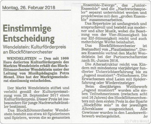 Die Marktgemeinde Wendelstein verlieh 2018 erstmals einen Kulturförderpreis. Träger des erstmalig ausgelobten Förderpreises ist das Blockflötenorchester flautississimo / Wendelstein. Die öffentliche Verleihung der Ehrenurkunde durch den 1. Bürgermeister Werner Langhans fand im April 2018 im Rahmen eines Benefizkonzertes statt.